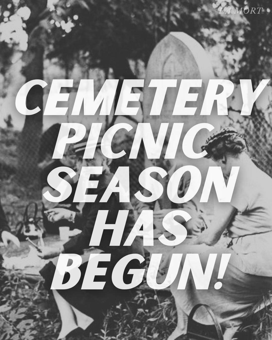 And so the season of picnicking in graveyards begins. This is a suggestion from La Mort on Insta. We like it. ‘Did you know that in the 1800s, cemeteries were literally the hottest picnic spots in town? Before public parks existed, places like Mount Auburn Cemetery and Père Lachaise were the destinations for a Sunday stroll and a packed lunch among the dearly departed.
