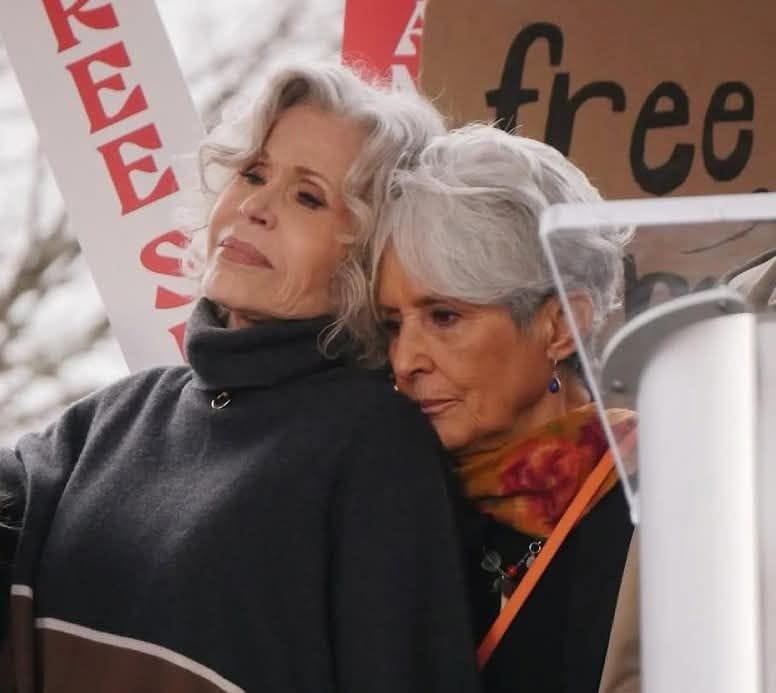 Jane Fonda 88, and Joan Baez 85, in this intimate, reflective photograph. They are still campaigning against Trump and against the wars/occupation and we need them desperately. I am writing this just as Trump is threatening to use nuclear weapons on Iran. We must speak out and Jane and Joan are immutable with their voices of resistance. Thank you Jane and Joan.