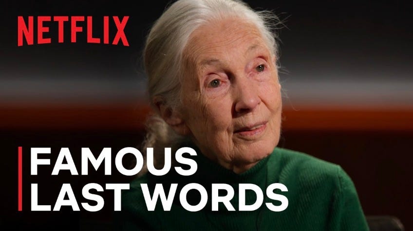 had this to say about this Netflix regular feature. This time on the great and inspirational Jane Goodall.‘Last night I watched “Famous Last Words with Jane Goodall” on netflix, and I’m still feeling pretty emotional about it.