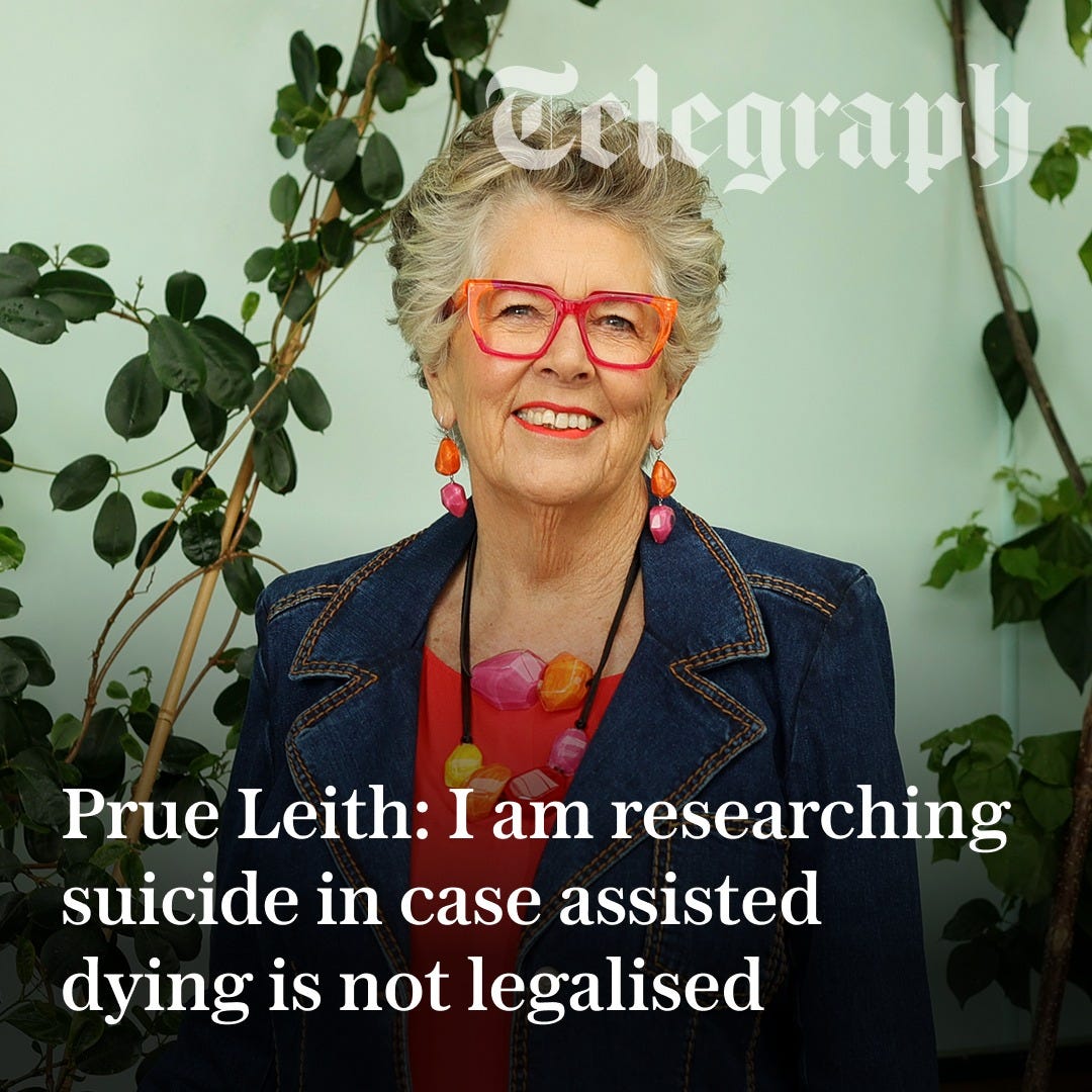 Such an important topic and so glad that Prue Leith is able to speak out about it. Her brother died in pain of cancer and she is determined not to have the same experience. Good on her. I wouldn’t call it suicide myself and that is probably the Telegraph, but I think it’s a good idea to think about how we can effectively end our lives in a pain-free way if assisted dying is not legalised.