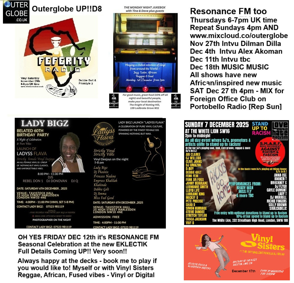 is involved with. ‘Outerglobe UP!!D8: Anyone would think I am a DJ! Got a few things coming UP!! This coming SATURDAY 29th I join Ebu Kashor Freestyle on Feferity Radio for the Vinyl Saturday fun from 6-8pm www.feferitylondon.co.uk and Youtube; MONDAY DEC 1st it’s the Monday Night Jukebox anew at The Knight of Notting Hill (aka KPH) from 7pm to late Free in Ladbroke Gove; SATURDAY DEC 6th it’s the big one - Lady Bigz’s belated 60th birthday bash with a host of female Vinyl DJs and more (Vinyl Sisters UK well to the fore) in Harlesden; SUNDAY DEC 7th I am one of 34 DJs playing at the The White Lion SW16, Streatham at Soul Movement against Racism & Fascism’s mega day 2-Midnight, then on FRIDAY DEC 12th it’s Resonance 104.4fm’s Seasonal Celebration and I will play there - at the new Eklectik in Peckham, AND after that it’s Vinyl Sisters with Outerglobe Femxle DJ Relay - 17th December (Free Entry)at Upstairs at the Ritzy - a bumper one! Add in my radio show The Outerglobe on Resonance 104.4fm/DAB & resonancefm.com every Thursday til Dec 18th [Repeated Sundays and in mixcloud.com/outerglobe ] AND a mix for the Foreign Office Club on Portobello Radio on SAT DEC 27th [Repeated Sunday 28th] AND THERE YOU HAVE IT!! Doing what I love!! My pleasure. ENJOY!! UP!!’