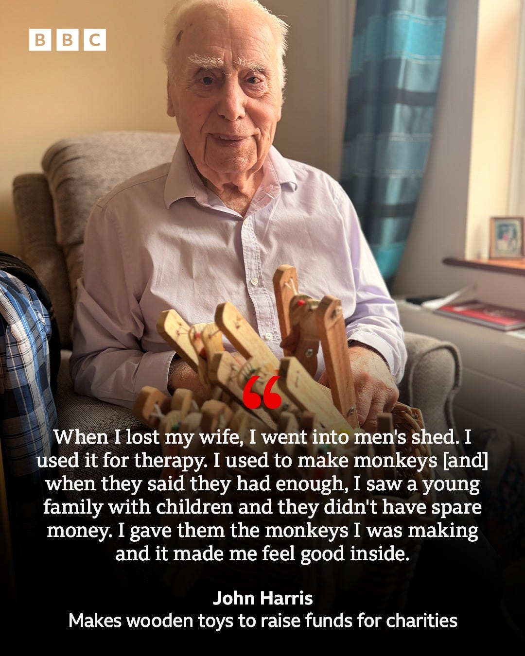 John Harris, who lives in a care home in Glastonbury, goes to the Street and Walton Men’s Shed - a place were people can socialise and use the workshop - twice a week to handcraft the wooden monkeys.