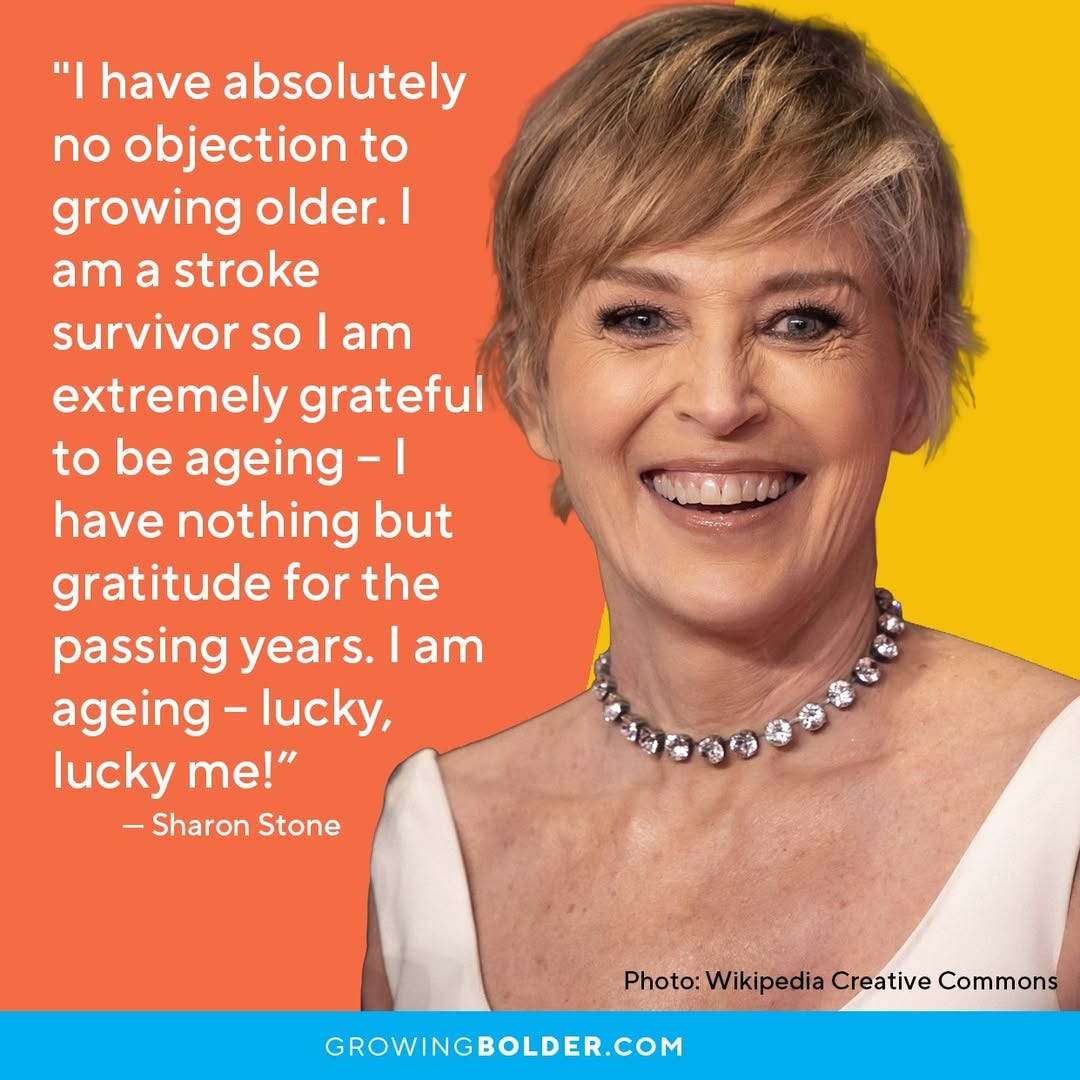 This is great to hear from Sharon Stone who is a star on the pro-ageing front. I keep meaning to start a daily gratitude practice as it seems so important to say thank you as we get older.