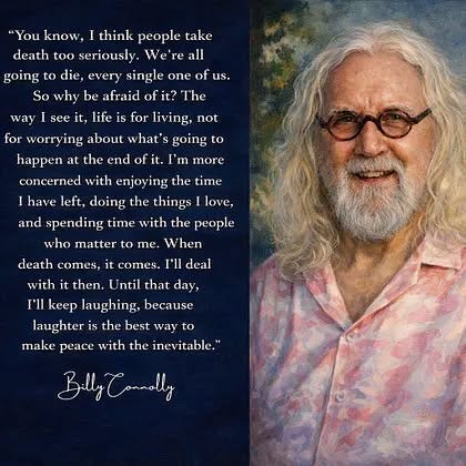 We love Billy Connolly and his attitude towards his Parkinson’s, always adapting to what his new situation is. And now he’s talking about laughing his way towards death. Why not? We can all get a bit too serious around death and dying….