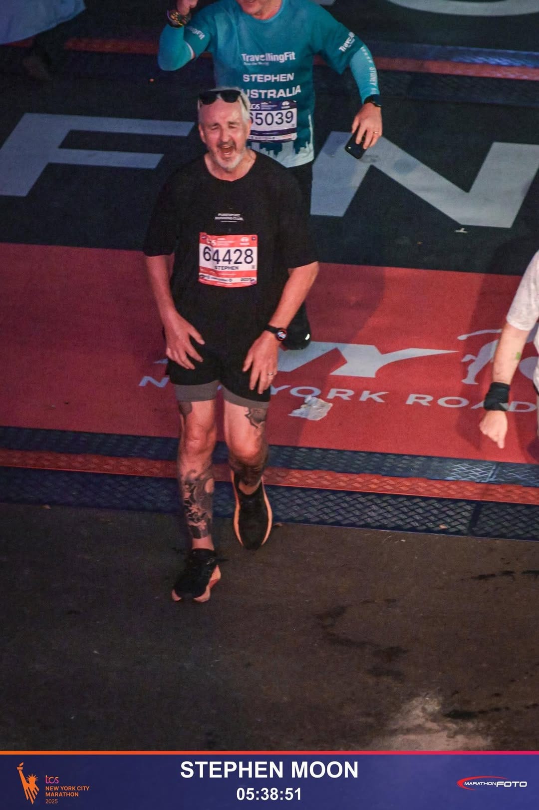 First up is Stephen Moon who travelled from London to NYC for his first marathon at the age of 68. Not only that but he’d also had two serious cycling accidents and injuries in the past two years. He raised over £6,000 for Chris Hoy’s Cancer charity. This is what he had to say: ‘Did it. Aimed for 5 hours 45 minutes and did it in 5 hours 38 minutes. Interesting tortoise and hare—I set out with a bunch of younger runners and they streaked away. By the end I had caught every single one of them, because my time per mile was consisted all the way. Every part of my body hurts now. Again, turns out that it’s not an age thing, there’re a younger runner in the room opposite in the same condition.