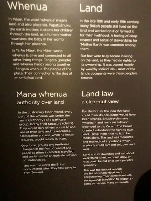 In the Waitangi Treaty Grounds Museum, there is a plaque describing the differences between what land means to Māori people and what it meant to those early white settlers. In Māori, the word for land as translated into English is whenua. Whenua also means placenta - as the info board says: Papatuanuku, the earth mother, sustains her children through the land, as a human mother nourishes her baby through her placenta. In other words, it is sacred, and inextricably part of the people who have lived upon it for generations, whose placentas would be ritually buried in the earth following every birth. Between 1890 and 1920 alone, Māori people lost nearly twelve million acres in Northland to the Crown. Half of their land. The loss continues.