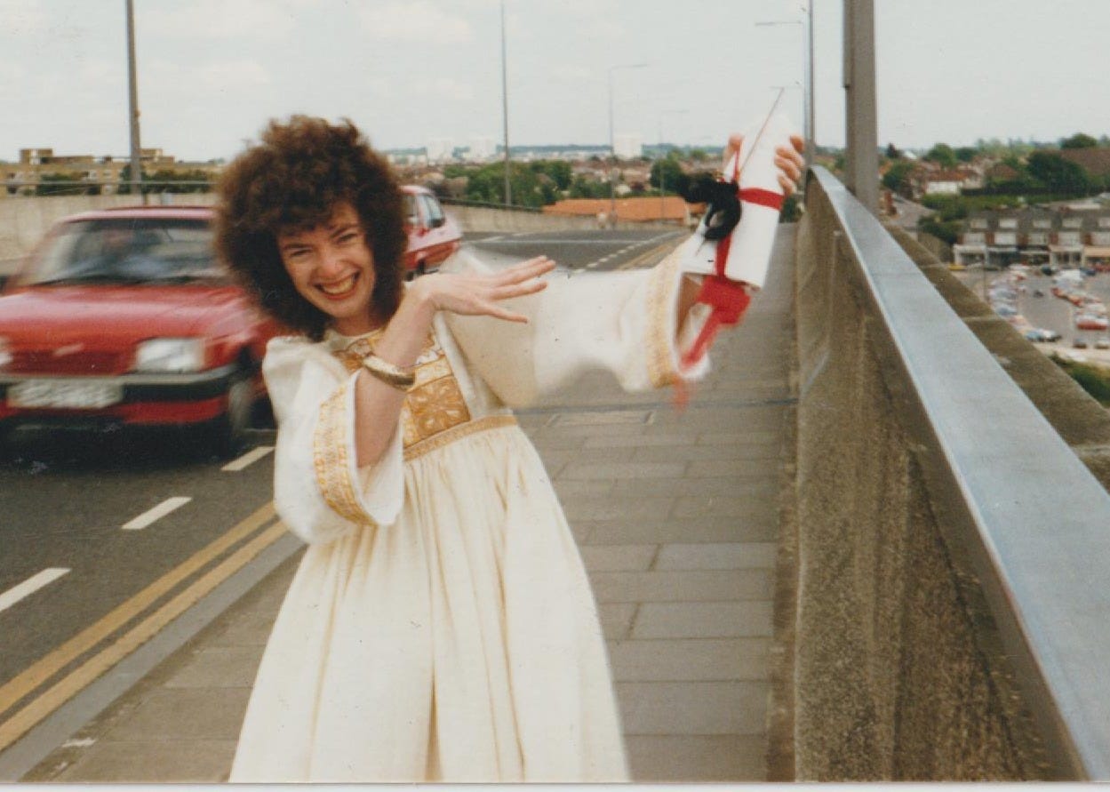 I used yards and yards of Mexican cotton and hand-embroidered the bodice from the Afghani Nomads Dress pattern. I made it for my UK post-wedding reception, but later wore it for rituals – this photo shows me throwing my 4th Year Med School project into the river Itchen - the project had been an absolute nightmare – cycling all over hilly Southampton, interviewing older members of the population about their mental health. I remember a lonely man who had kept his budgie in the freezer after it died and insisted on showing it to me.