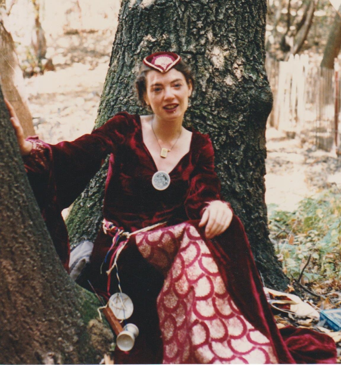 I didn’t take the wedding very seriously – my vow was to stay with him ‘until life us do part’– but it was a bloody good excuse to buy a new sewing machine to make my wedding dress, and to indulge my love of dressing up. I thought I was making a wise choice with a Singer electric machine, but Singer didn’t make quality machines in the 1970s, and I remember really struggling to sew the slippery velvet I’d chosen. I fancied the gown worn in a portrait of Anne Boleyn. I didn’t know how to draft patterns back then, and commercial patterns for costumes were uncommon. Someone had a friend in the theatre who made me a pattern. I not only wore the dress for the wedding, but it had outings to several Renaissance Fayres, a feature of Northern California back in the early 1980s, and I was even wearing it to the Ale Tasting and Bread Weighing Fayre in Ashburton in 2002.