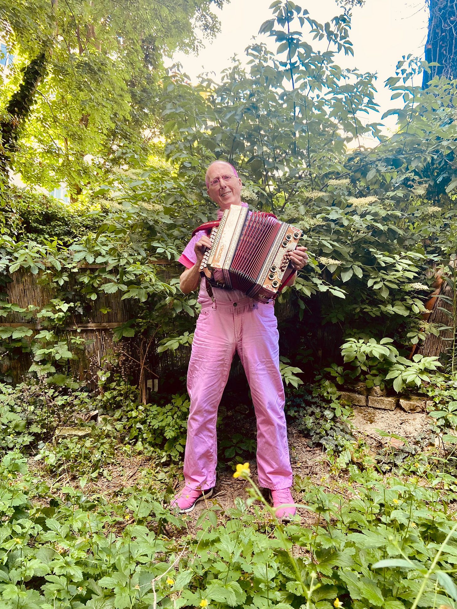 Playing button accordion in my Vienna garden in 2024 Photo by Florian Gebauer.