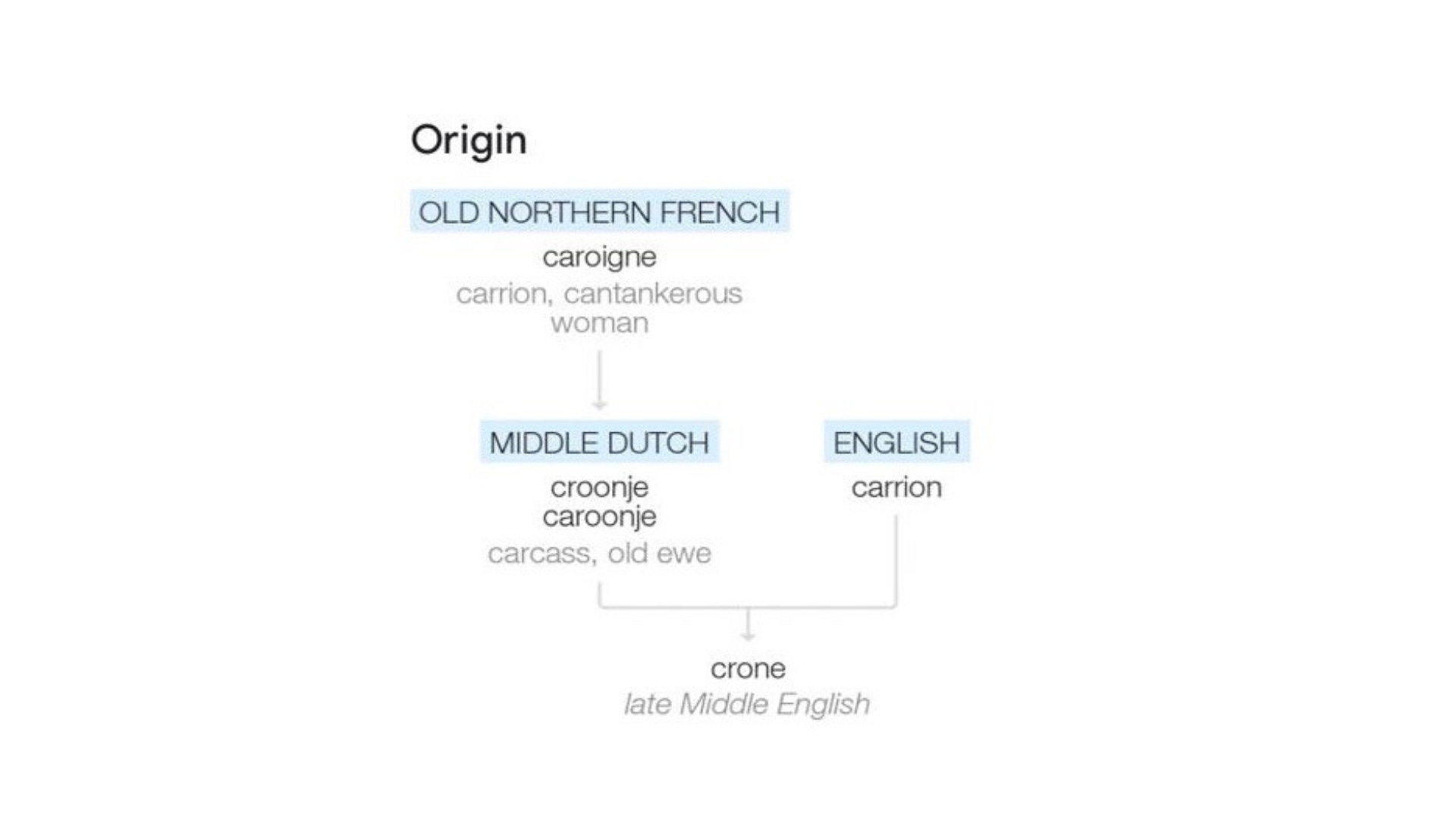 In 2021 I did a presentation to fellow content geeks called ‘Rebranding Crone’. At the time, the top results from a quick Google of ‘crone’ confirmed my negative feelings about it. At best, the crone was described as a “Disagreeable or cantankerous old woman.” At worst, the word seemed to have derived from the Old Northern French word ‘caroigne’, and the English word ‘carrion’, literally meaning rotting meat or feted corpse.