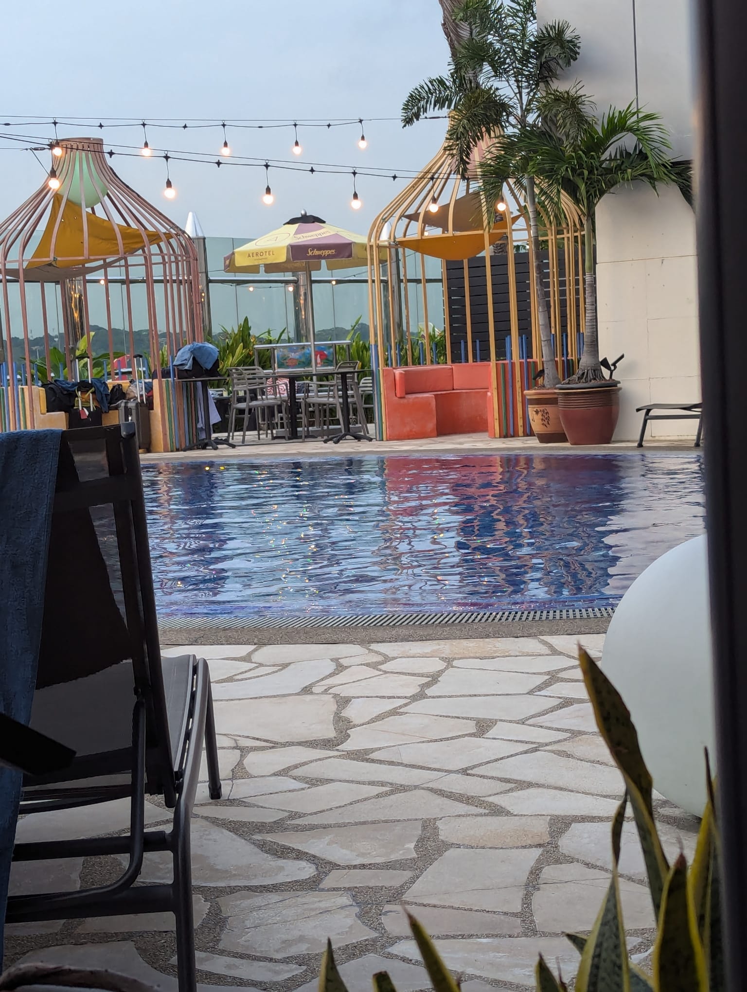 I had done a little research on Changi Airport before my journey and had discovered that there were lots of facilities there. I was looking for something restorative, and the highlight was that there is a rooftop, open air pool at the Aerotel hotel inside terminal one with a bar and bistro. I couldn’t think of a better way for my body to recover. However, I found out that it closed at night and that I would be transferring at night. I was pretty sure I would completely miss it. But I had somehow got my Singapore arrival time wrong… oops was that another mental aberration? As soon as I got into into the terminal, which was T2, I found an information desk and a delightful woman informed me that not only was the pool still open but but it would be open for another three and a half hours until 10 pm! JOY!!!
