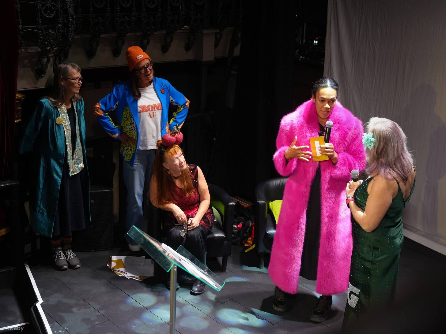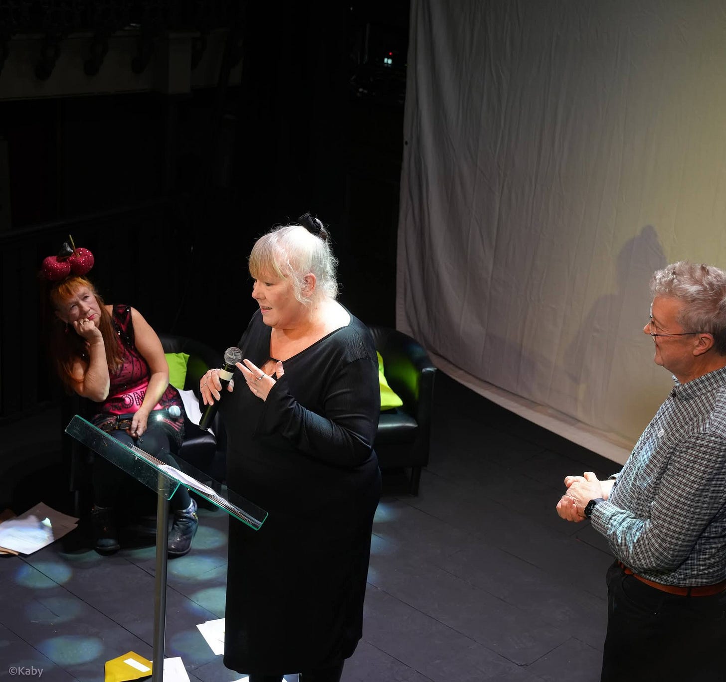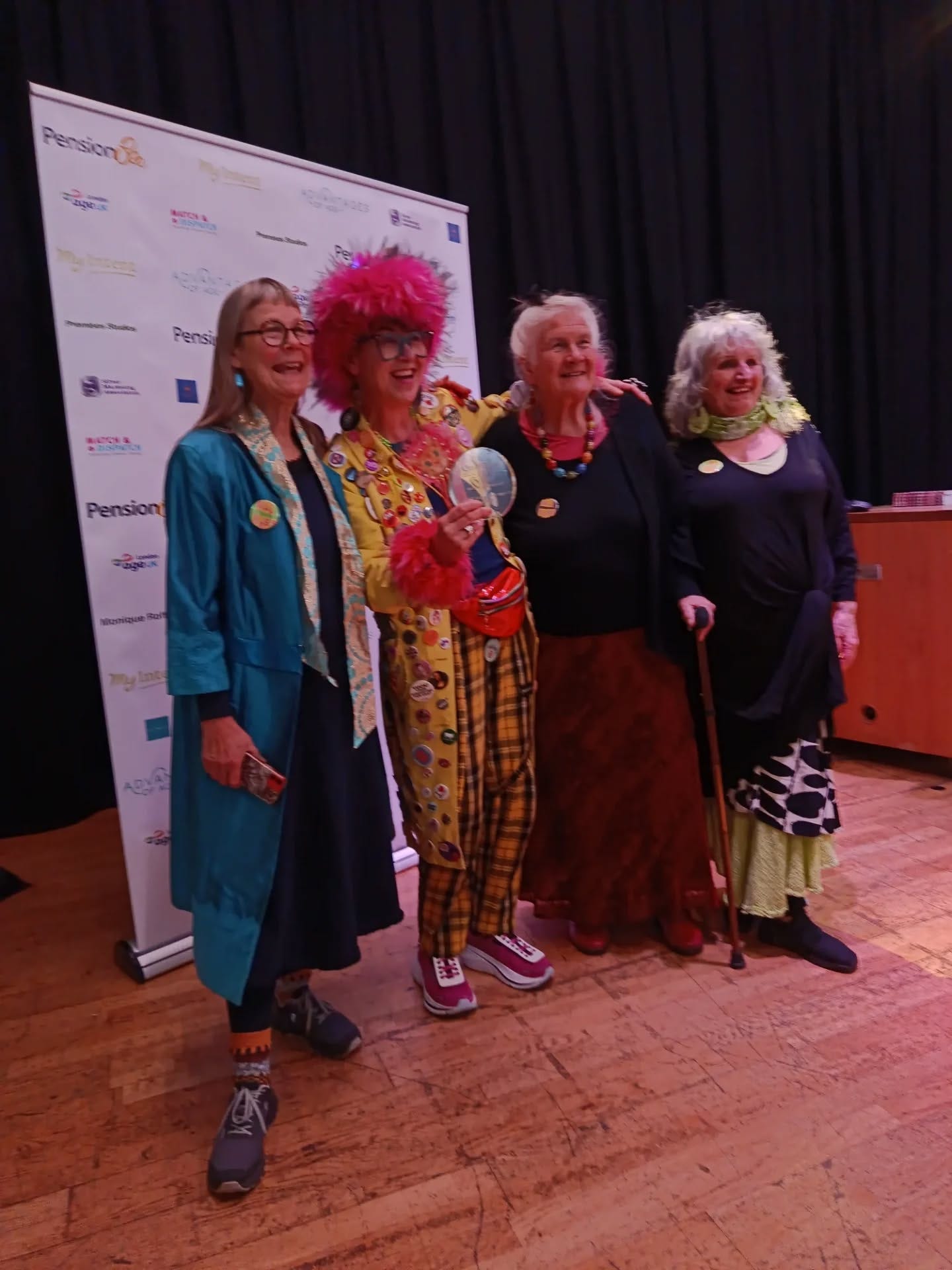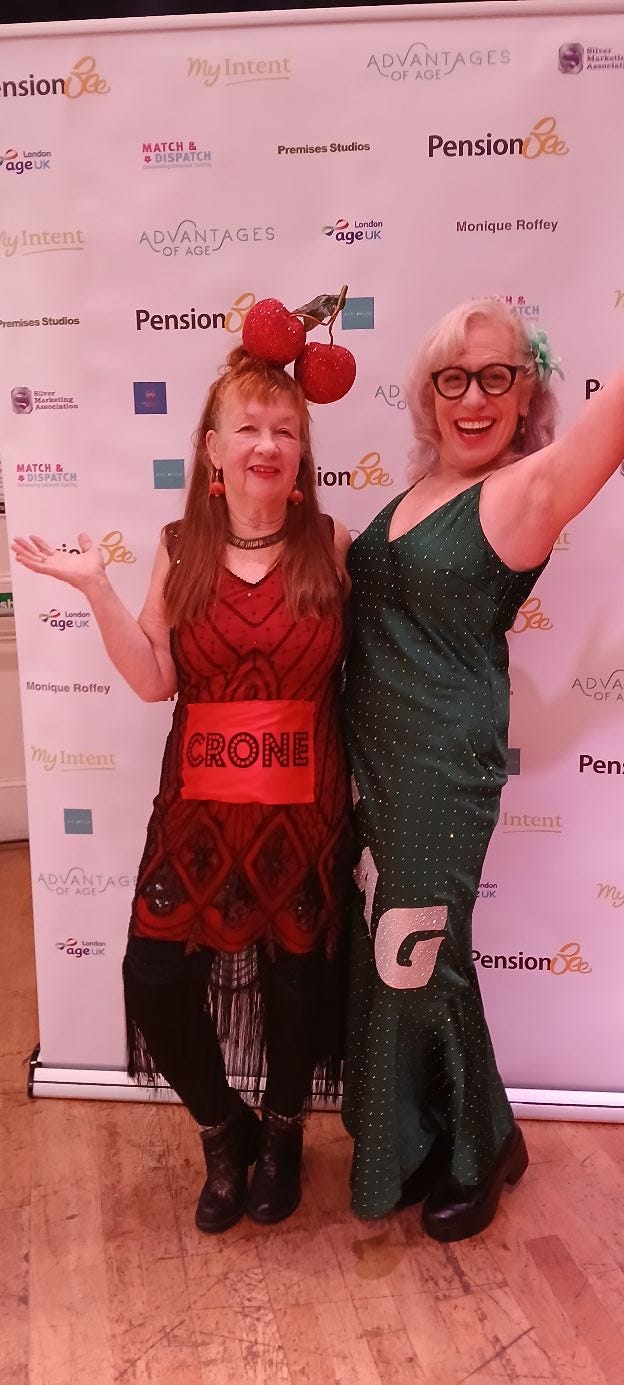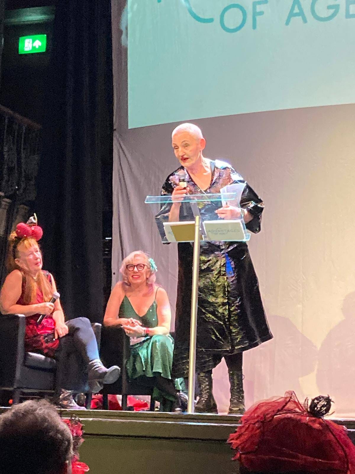 Something else that has been on my mind is – all the individuals who are doing amazing work re challenging stereotypes around ageing and how they struggle financially to survive. Quite a few recipients of our awards – including Justine Gaubert who founded The Crone Club in Sheffield for post-menopausal women or crones-in-waiting – mentioned how difficult it was to keep going. And that collaboration is the way forward. We totally agree and hope that the Awards Ceremony itself is a place to connect or ‘mingle’ as I say and make these important relational links with others. And I saw it happen before my very eyes. Justine, the active Crone that she is, was out and about around the theatre, making great links with other people. No doubt, they’ll all become features in the Crone Club magazine, Tits to the Wind.